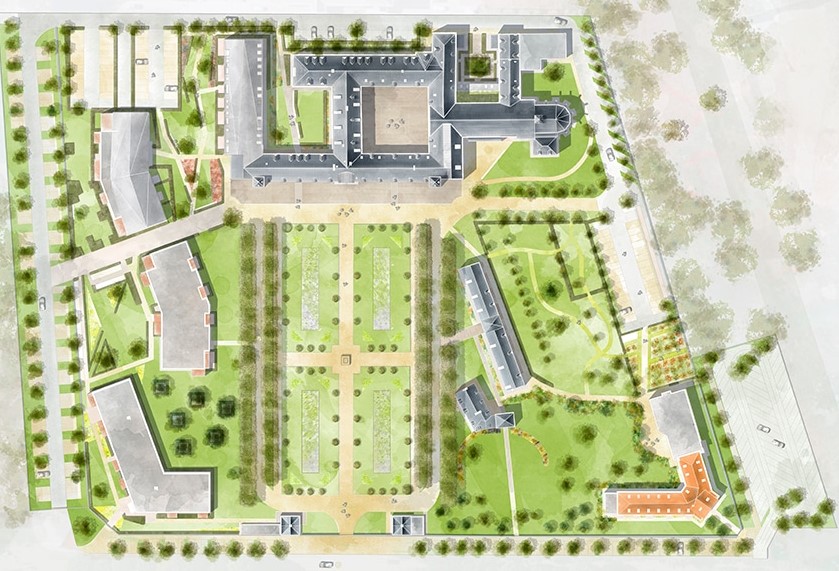 The hospital was now disused. Its rehabilitation and transformation were designed by the team of architect Hubert Maes. The Marguerite de Flandres residence is composed of 93 independent dwellings in the old buildings and a hundred or so modern dwellings in a contemporary extension that respects the character of the hospital.