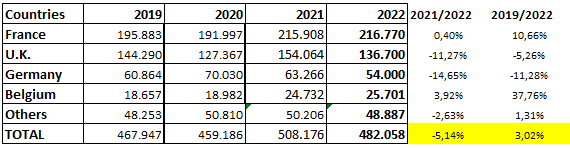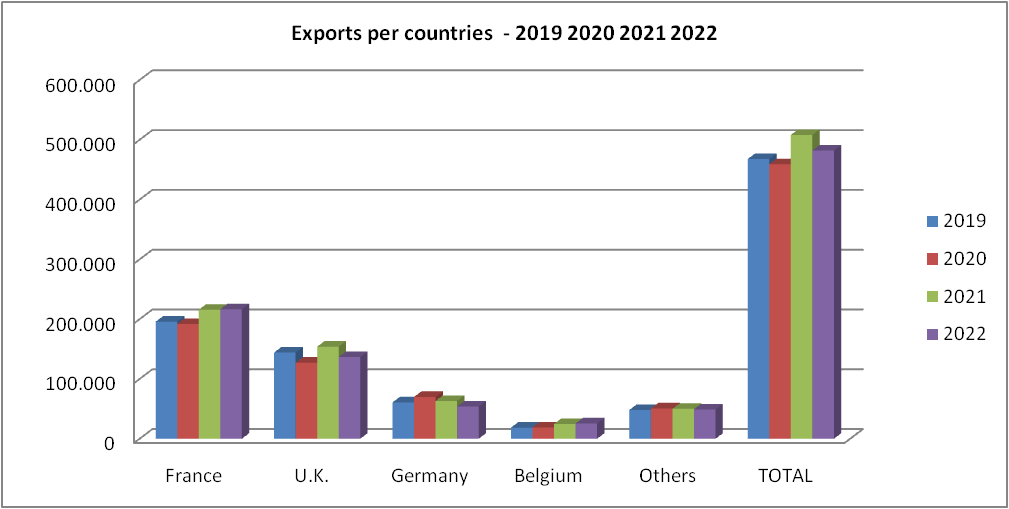 Although export figures are more modest than those of previous countries, due to its size, the Belgian market continues to show strong growth (+37.76% compared to 2021). It is still a market based on high-end qualities, with high purchasing power and, with support for construction reforms, continues to bear fruit.