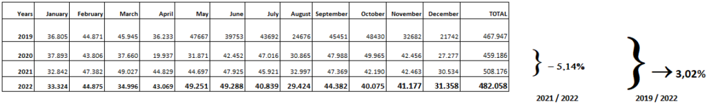We can see another significant example of this weakness. If we compare the data for 2022 and 2021 (two years with the same situation of high demand and minimal stocks), export volumes fall from 482,058 Tn. in 2022 to 508,176 Tn. in 2021, i.e. a loss of almost 26,118 Tn. exported (-5.1%).