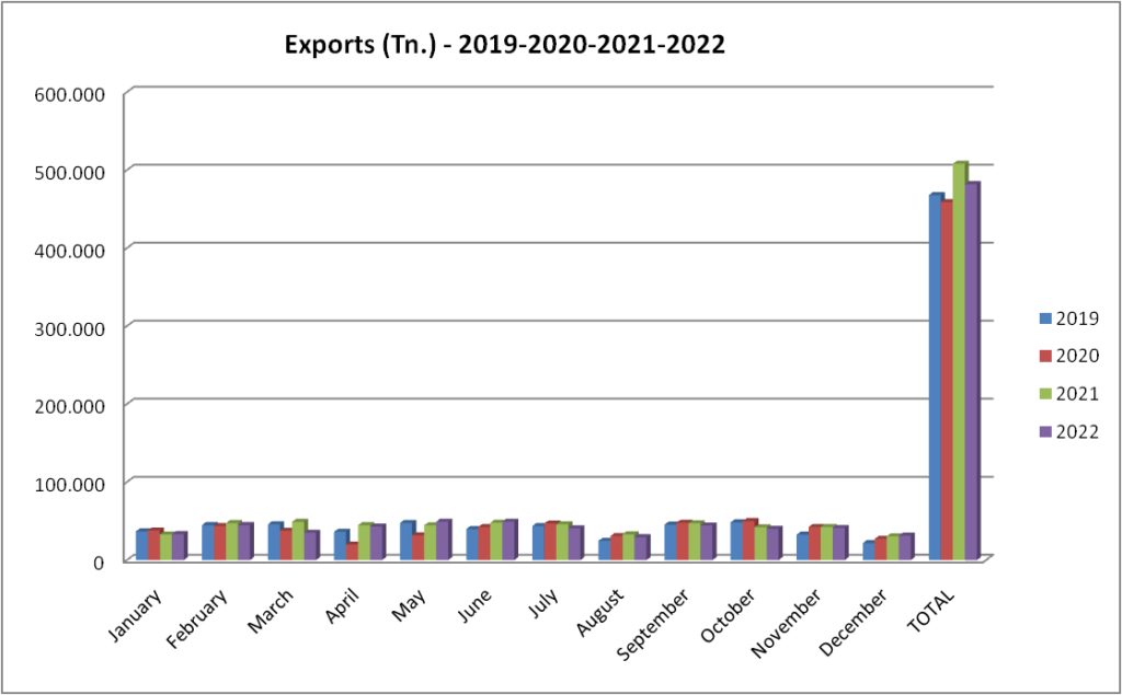 This shows how the volume of exports in tonnes at the end of November is -5.14% compared to the same period in 2021, all this without available stocks and with delivery times that have not been reduced.